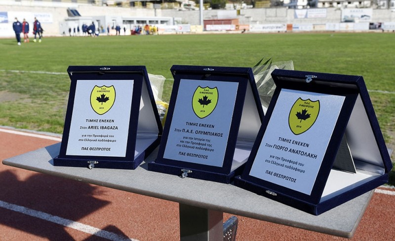 Ο Ολυμπιακός Β’ είχε εκτός έδρας δοκιμασία, για τη Σούπερ Λιγκ 2, στην έδρα του Θεσπρωτού. Ο Θρύλος έχει δοξάσει και συνεχίζει να δοξάζει το ελληνικό ποδόσφαιρο και ο Θεσπρωτός, πριν τη μάχη με τον Ολυμπιακό Β’ τίμησε τους πρωταγωνιστές. Ιμπαγάσα-Ανατολάκη, αλλά και την ΠΑΕ συνολικά, πλακέτα την οποία παρέλαβε ο Διευθυντής Επικοινωνίας, Νίκος Γαβαλάς.