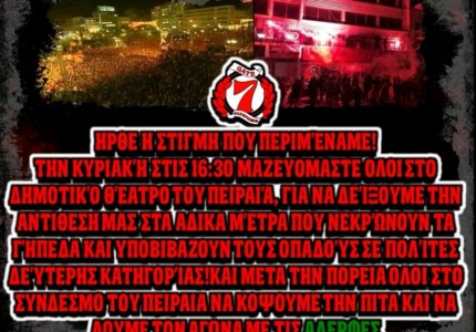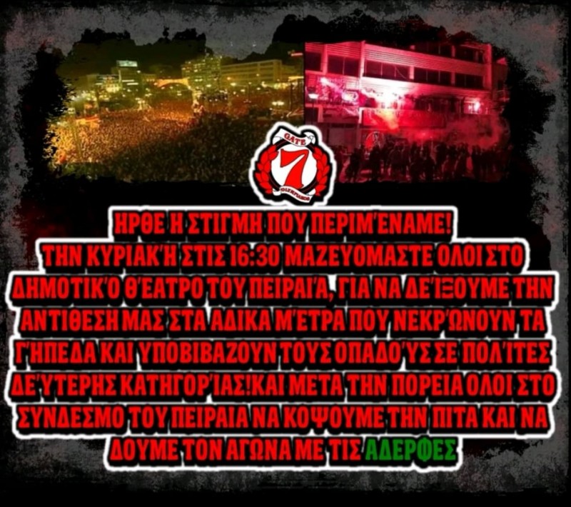 Ειρηνική διαμαρτυρία ετοιμάζουν, ως γνωστόν, οι οπαδοί του Ολυμπιακού, για να δείξουν την αντίθεσή τους στα περιοριστικά μέτρα τα οποία κρατούν τους φιλάθλους μακριά από τις εξέδρες των γηπέδων. Με νεότερη ανάρτησή της η ΘΥΡΑ 7 θυμίζει την ώρα και τον τόπο, για την ειρηνική αυτή διαμαρτυρία κατά των περιοριστικών μέτρων στα γήπεδα και καλεί σε ανταπόκριση.