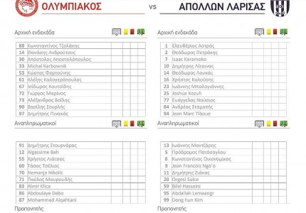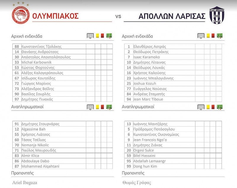 Τον Απόλλωνα Λάρισας υποδέχεται στο Ρέντη ο Ολυμπιακός για την 21η αγωνιστική και ο Αριέλ Ιμπαγάσα θέλει μόνο την νίκη. Για αυτόν τον λόγο έχει επιλέξει ένα πολύ επιθετικό σχήμα για το παιχνίδι, καθώς θέλει να δει τους παίκτες του να κυνηγούν το γκολ και να επικρατήσουν των Λαρισαίων.