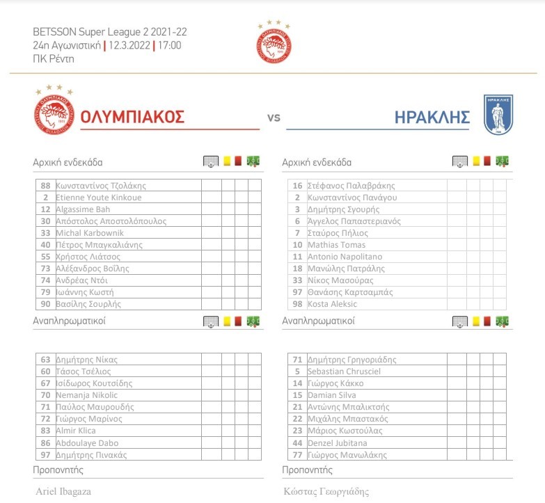Στον πάγκο βρίσκονται οι: Νίκας, Τσέλιος, Κουτσίδης, Νίκολιτς, Μαυρουδής, Μαρίνος, Κλίτσα, Νταμπό και ΠΙνακάς.
