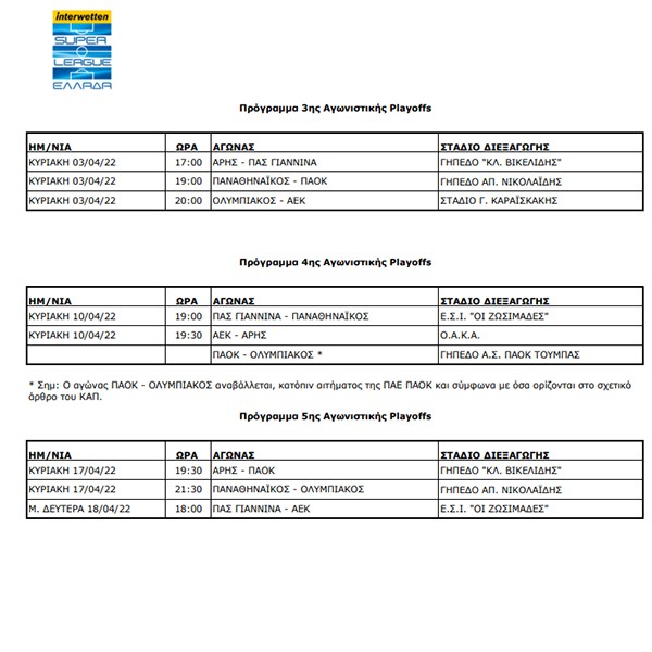 * Σημ: Ο αγώνας ΠΑΟΚ - ΟΛΥΜΠΙΑΚΟΣ αναβάλλεται, κατόπιν αιτήματος της ΠΑΕ ΠΑΟΚ και σύμφωνα με όσα ορίζονται στο σχετικό
