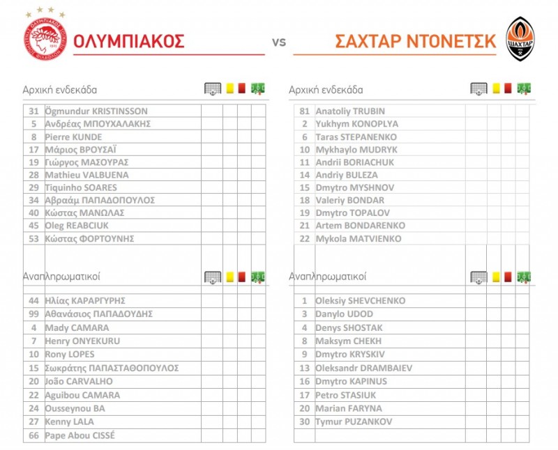 Ο Ολυμπιακός στο πρώτο ημίχρονο είχε ελαφρά υπεροχή. Δεν είχε πολλές φάσεις, κλασσικές ευκαιρίες που λέμε, αλλά είχε την υπεροχή, σε σχέση με τη Σαχτάρ, την οποία για μεγάλο διάστημα του πρώτου ημιχρόνου, κρατούσε στο δικό της μισό. Το γκολ του Τικίνιο στο 22’, σεντερφορίσιο γκολ, έδωσε στον Ολυμπιακό δίκαιο προβάδισμα. Λίγο μετά, στο 28’, ο Μπουχαλάκης βγήκε, καθώς είχε ενοχλήσεις. Νωρίτερα είχε αποχωρήσει ο Κονόπλια, για τον ίδιο λόγο.