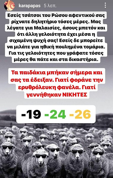 «Εσείς, τσάτσοι του Ρώσου αφεντικού σας, ρίχνατε δηλητήριο τόσες μέρες. Μας λέγατε για Μαλαισίες, άσους μπετόν και ότι άλλη γελοιότητα έχει μέσα η σιχαμένη ψυχή σας! Εσείς δε μπορείτε να μιλάτε για ηθική πουλημένα τομάρια. Για τις γελοιότητες που γράφατε τόσες μέρες θα πάτε και στα δικαστήρια.