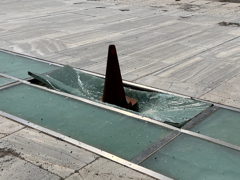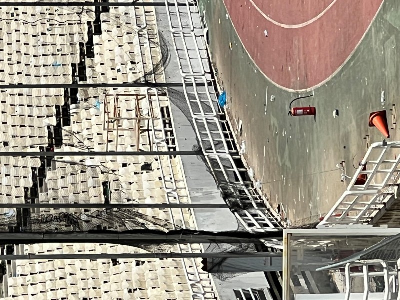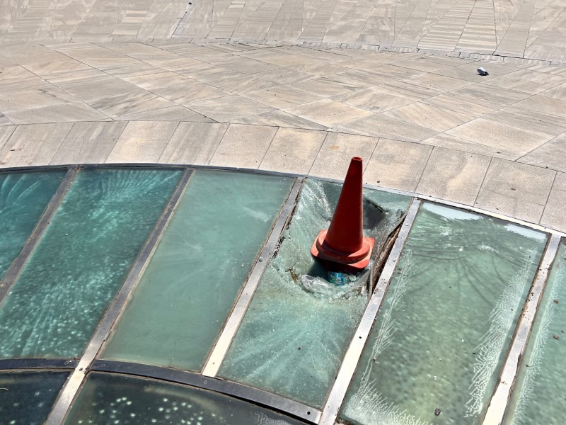 - Δημοσιογραφικά θεωρεία, με σπασμένα plexiglass και καρέκλες