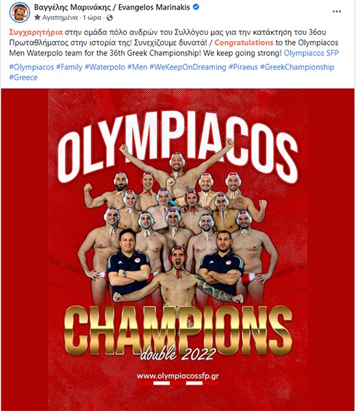 «Συγχαρητήρια στην ομάδα πόλο ανδρών του Συλλόγου μας για την κατάκτηση του 36ου Πρωταθλήματος στην ιστορία της! Συνεχίζουμε δυνατά».