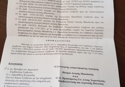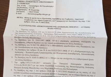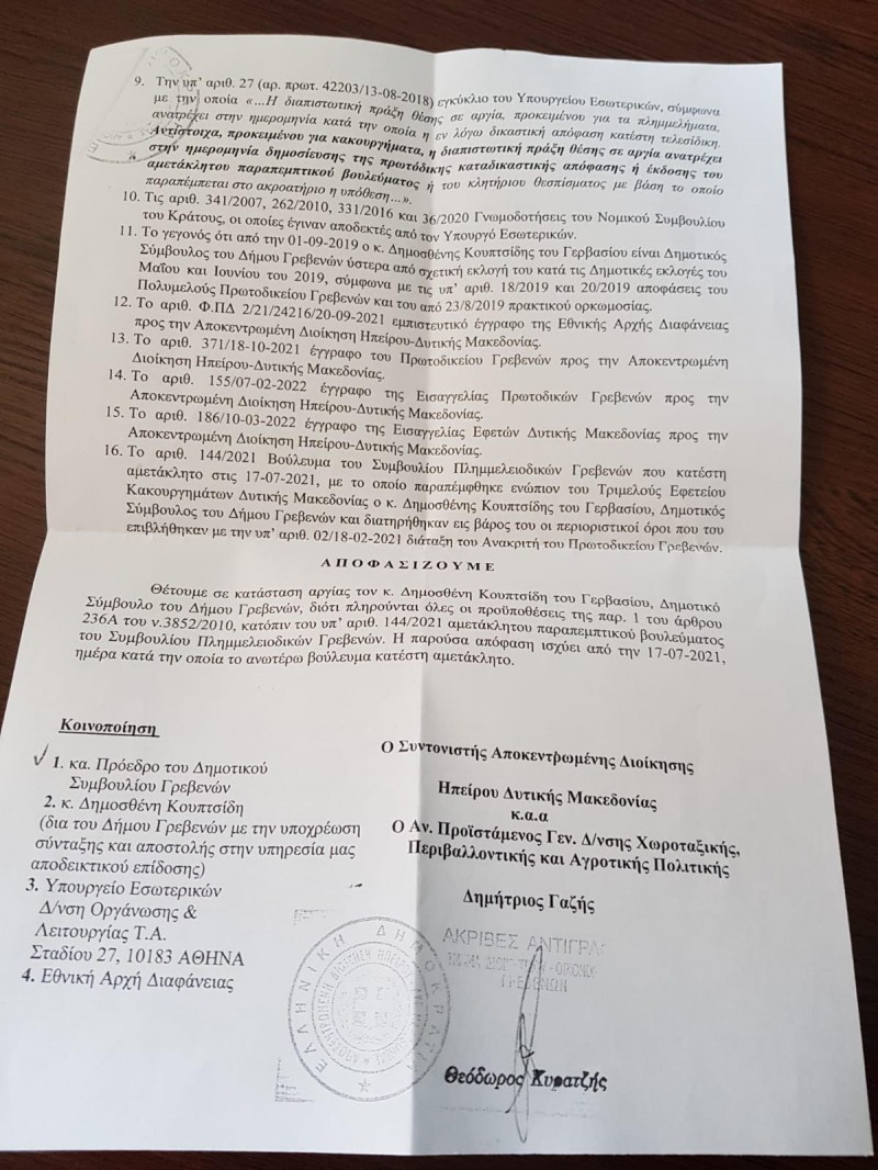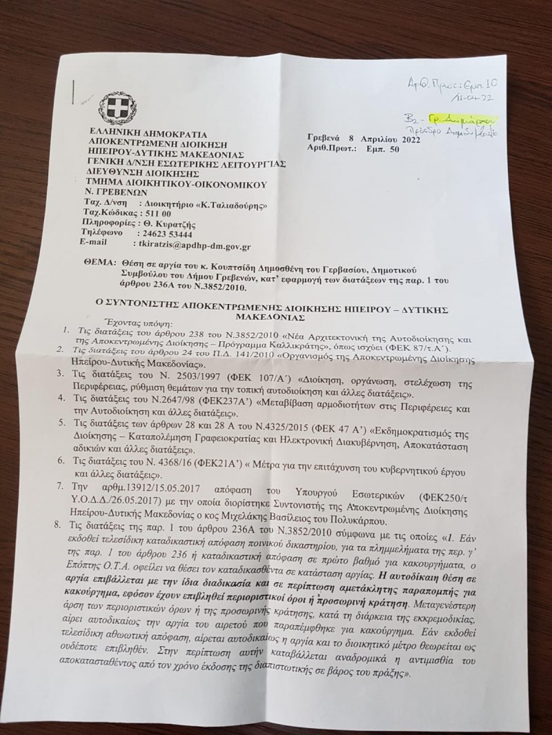 Το έγγραφο του συντονιστή αποκεντρωμένης διοίκησης Ηπείρου-Δυτικής Μακεδονίας που θέτει σε αργία τον Δημοσθένη Κουπτσίδη από το Δημοτικό Συμβούλιο του Δήμου Γρεβενών: