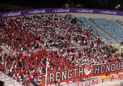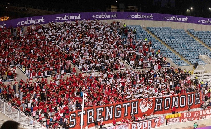 Εντυπωσιακό, όπως πάντα, ήταν το κορεό που έκαναν οι οπαδοί του Ολυμπιακού πριν την έναρξη του αγώνα με τον Απόλλωνα Λεμεσού, στο ΓΣΠ της Λευκωσίας.