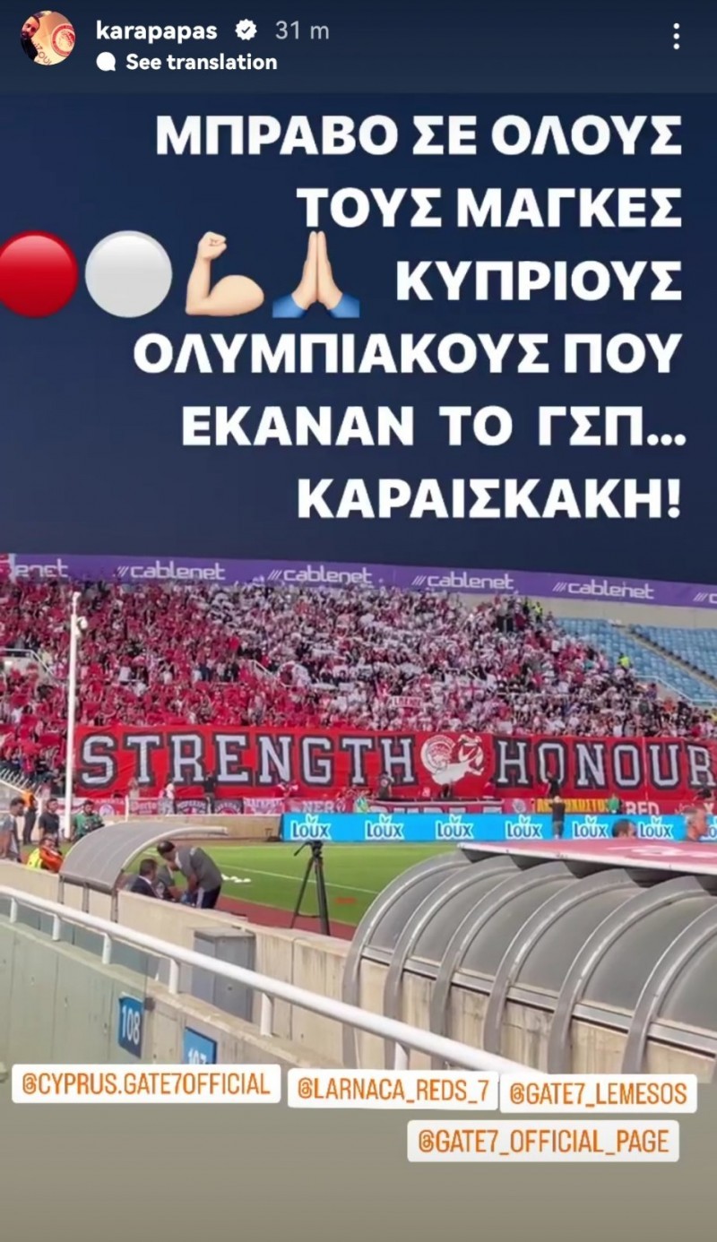 «Μπράβο σε όλους τους μάγκες από Κύπριους Ολυμπιακούς, που έκαναν το ΓΣΠ… Καραϊσκάκη», έγραψε χαρακτηριστικά ο Κώστας Καραπαπάς.