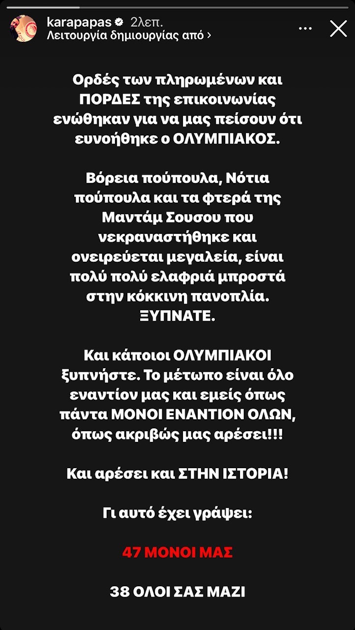 Μια ανάρτηση του Κώστα Καραπαπά στο Instagram, έβαλε τα πράγματα στη θέση τους. Του αγώνα στην Τρίπολη ακολούθησαν που πολλά. Μια οργανωμένη προσπάθεια εις βάρος του Ολυμπιακού, με συνεχόμενα δημοσιεύματα και αναρτήσεις ορδών υπαλλήλων και όχι μόνο.