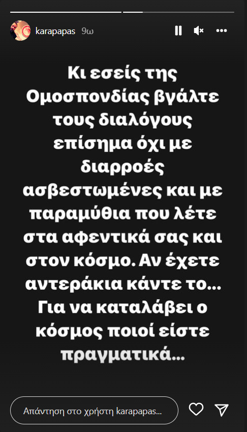 Έπειτα, σχολίασε και το εξής: «Κι εσείς της Ομοσπονδίας βγάλτε τους διαλόγους επίσημα, όχι με διαρροές ασβεστωμένες και με παραμύθια που λέτε στα αφεντικά σας και στον κόσμο. Αν έχετε αντεράκια κάντε το... Για να καταλάβει ο κόσμος ποιοι είστε πραγματικά...».
