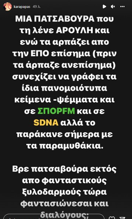 «Μία ΠΑΤΣΑΒΟΥΡΑ που τη λένε ΑΡΟΥΛΗ και ενώ τα αρπάζει από την ΕΠΟ επίσημα (πριν τα άρπαζε ανεπίσημα) συνεχίζει να γράφει τα ίδια πανομοιότυπα κείμενα-ψέματα και σε ΣΠΟΡFM και σε SDNA αλλά το παράκανε σήμερα με τα παραμυθάκια.