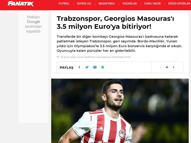 «Τελειωμένη» παρουσιάζουν σήμερα (2/9) στην Τουρκία την μεταγραφή του Γιώργου Μασούρα στην Τράμπζονσπορ.