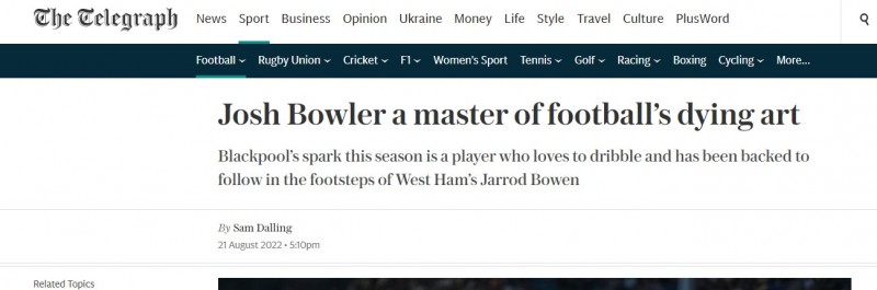 Μάλιστα, πρόσφατα, η βρετανική εφημερίδα «Telegraph» είχε φιλοξενήσει εκτενές αφιέρωμα στο νέο μεταγραφικό απόκτημα του Ολυμπιακού, το οποίο παρουσιάζει μεγάλο ενδιαφέρον. Ο τίτλος του ήταν «Τζος Μπόουλερ, ένας μάστερ της τέχνης του ποδοσφαίρου που πεθαίνει»…