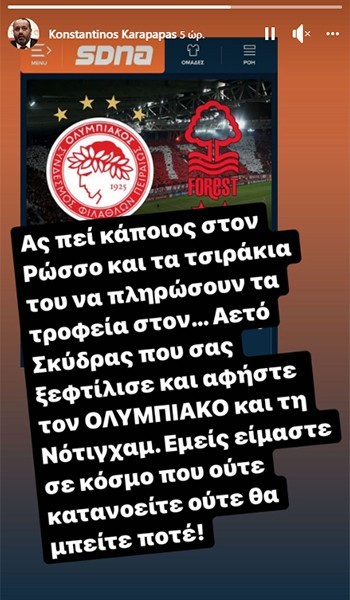 Την απάντησή του στην αθλητική ιστοσελίδα «SDNA» έδωσε μέσω ενός story στον προσωπικό λογαριασμό του στο Instagram, ο Κώστας Καραπαπάς, σχετικά με ένα άρθο που ενέπλεκε τον Θρύλο και την Νότιγχαμ.