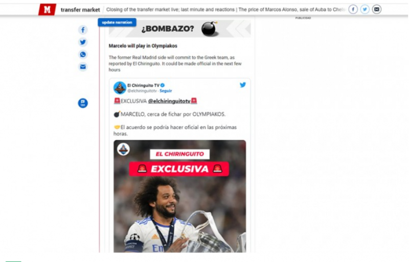 Ακόμη και η Marca έκανε θέμα για την επόμενη ομάδα του Μαρσέλο, που θα είναι ο Ολυμπιακός, όπως τονίζει η ιστοσελίδα από τη Μαδρίτη της Ισπανίας!