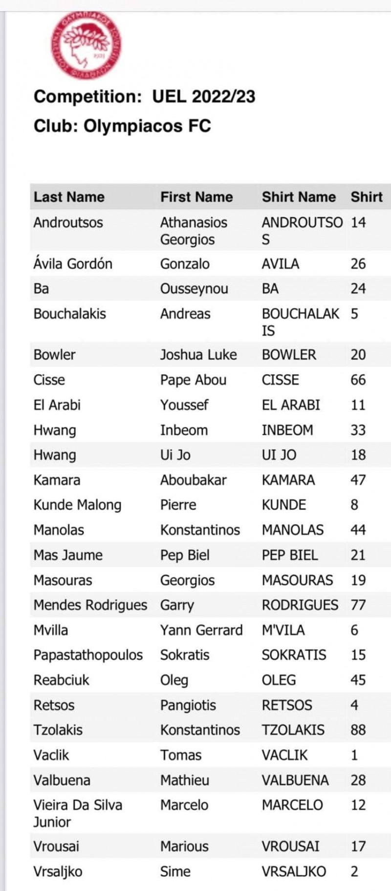 Μάλιστα, ο ίδιος μπήκε και στο ρόστερ του Θρύλου, στην επίσημη ιστοσελίδα της ΠΑΕ Ολυμπιακός, και μάλιστα πήρε τον αγαπημένο του αριθμό.