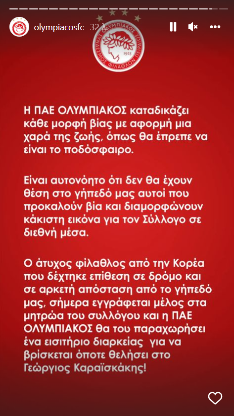 Ο άτυχος φίλαθλος από την Κορέα, που δέχτηκε επίθεση σε δρόμο και σε αρκετή απόσταση από το γήπεδό μας, σήμερα εγγράφεται μέλος στα μητρώα του Συλλόγου και η ΠΑΕ Ολυμπιακός θα του παραχωρήσει ένα εισιτήριο διαρκείας για να βρίσκεται όποτε θελήσει στο ‘Γεώργιος Καραϊσκάκης’», έγραψε χαρακτηριστικά η «ερυθρόλευκη» ΠΑΕ.