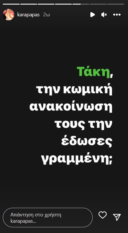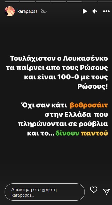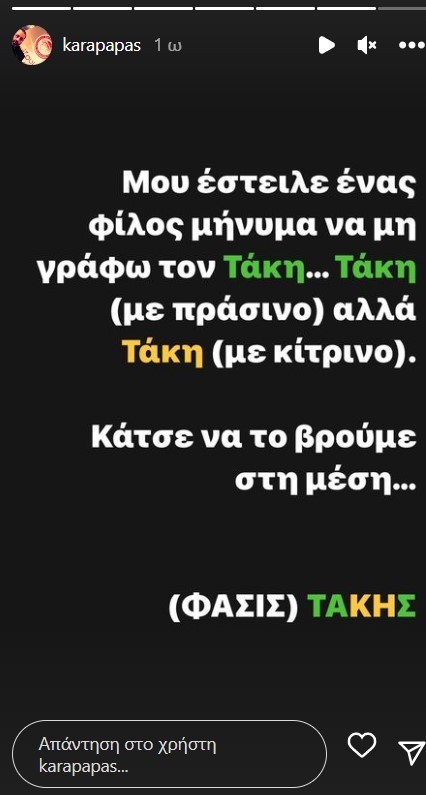 Το μήνυμά του έστειλε ο Γενικός Διευθυντής του Ολυμπιακού, Κώστας Καραπαπάς, χωρίς να διευκρινίζει σε ποιον απευθύνεται. Δείτε τι είπε χαρακτηριστικά: «Τάκη, την κωμική ανακοίνωση τους την έδωσε γραμμένη; Τουλάχιστον ο Λουκασένκο τα παίρνει από τους Ρώσους και είναι 100-0 με τους Ρώσους! Όχι σαν κάτι βοθροσάιτ στην Ελλάδα που πληρώνονται σε ρούβλια και το… δίνουν παντού. Μου έστειλε ένας φίλος μήνυμα να μην γράφω τον Τάκη… Τάκη με πράσινο, αλλά Τάκη με κίτρινο. Κάτσε να το βρούμε στη μέση… (ΦΑΣΙΣ) ΤΑΚΗΣ», ανέφερε χαρακτηριστικά στο μήνυμά του.