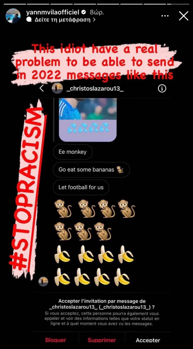 Συγκεκριμένα, το απίστευτο μήνυμα που δέχτηκε ο Εμβιλά, μετά το ντέρμπι με τον Παναθηναϊκό, έγραφε τα εξής: «Εεε μαϊμού, πήγαινε φάε μερικές μπανάνες και άσε το ποδόσφαιρο για εμάς». Το σοκαριστικό μήνυμα κοινοποίησε ο ίδιος ο Γάλλος άσος, που απάντησε, γράφοντας: «Αυτός ο ηλίθιος έχει πρόβλημα για να στέλνει τέτοια μηνύματα το 2022».