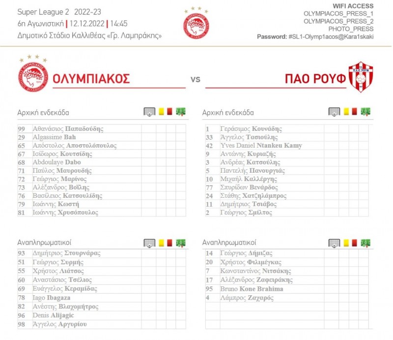 Αναλυτικά η ενδεκάδα του Ολυμπιακού: Παπαδούδης, Αποστολόπουλος, Κουτσίδης, Χρυσόπουλος, Κατσουλίδης, Νταμπό, Μαρίνος, Μαυρουδής, Κωστή, Βοΐλης, Μπα.