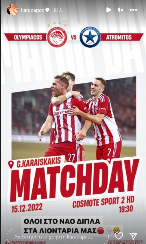 Όμως, για να συμβεί αυτό, οι Πειραιώτες χρειάζονται δίπλα τους τον κόσμο τους και ο Κώστας Καραπαπάς τόνισε αυτό ακριβώς… Μήνυμα ενότητας και πάθους από τον Αντιπρόεδρο του Θρύλου, στα social media, για το αποψινό παιχνίδι.