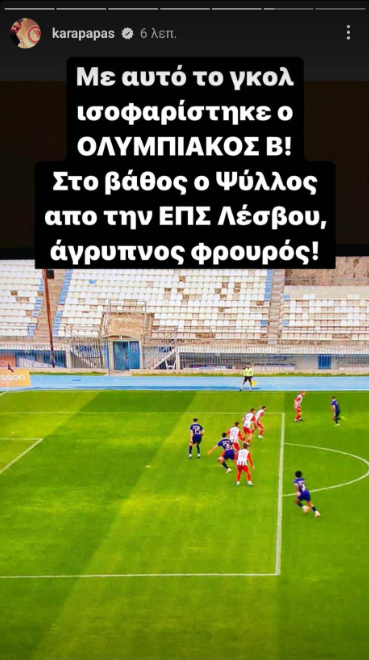 Ο Αντιπρόεδρος του Ολυμπιακού, Κώστας Καραπαπάς, με ανάρτησή του, τοποθετήθηκε για το γκολ που είχε την υπογραφή της «εξυγίανσης», ποστάροντας μία φωτογραφία, στην οποία έγραψε: «Με αυτό το γκολ ισοφαρίστηκε ο Ολυμπιακός Β’. Στο βάθος ο Ψύλλος από την ΕΠΣ Λέσβου, άγρυπνος φρουρός!».