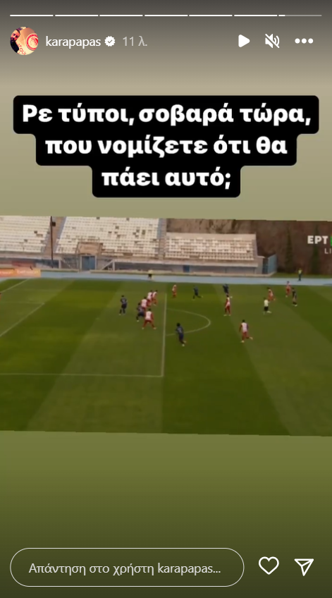 Στη συνέχεια, ο Κώστας Καραπαπάς πόσταρε το γκολ-οφσάιντ της Καλλιθέας σε βίντεο, γράφοντας: «Ρε τύποι, σοβαρά τώρα, που νομίζετε ότι θα πάει αυτό;».