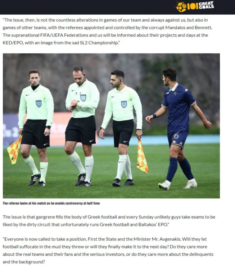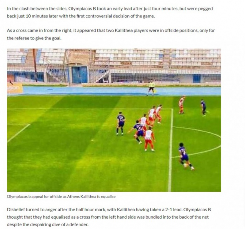 Ο Μπεν Μπράουνινγκ, μάλιστα, κάνει αναλυτική περιγραφή των φάσεων και με φωτογραφίες στο 101 Great Goals (μπορείτε να δείτε το θέμα ΕΔΩ) και έπειτα στέκεται στην ανακοίνωση-αντίδραση του Θρύλου. Ο ίδιος ανέφερε χαρακτηριστικά, ότι δεν ήταν η πρώτη φορά που ο Ολυμπιακός αντέδρασε για το θέμα της διαιτησίας στη Super League 2, καθώς το ίδιο είχε κάνει και μετά την αναμέτρηση με το Αιγάλεω.