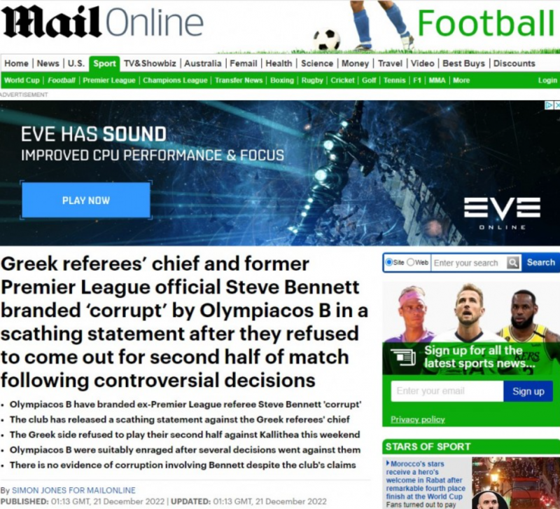 Από την άλλη, η γνωστή ιστοσελίδα Daily Mail από την άλλη στέκεται περισσότερο στον Στιβ Μπένετ, για τον οποίο γράφει πως ο Ολυμπιακός, μέσω ανακοίνωσής του, χαρακτηρίζει «διεφθαρμένο». Επίσης, αναφέρθηκε στις τιμωρίες των διαιτητών της αναμέτρησης με την Καλλιθέα και την συγγνώμη τους προς την ομάδα του Γιάννη Οκκά, για τα διαιτητικά «εγκλήματα».