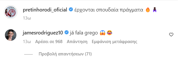 «Έρχονται σπουδαία πράγματα», έγραψε ο Ροντινέι, σε ανάρτησή του στα ελληνικά, με τον Χάμες Ροντρίγκες να του κάνει ένα... πείραγμα, σχολιάζοντας: «Ήδη μιλάει ελληνικά»!