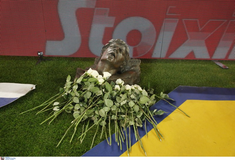 Πρώτα οι παίκτες του Θρύλου πήγαν μπροστά από το πέταλο της Θύρας 7 και άφησαν από ένα λουλούδι και χειροκροτήθηκαν από τον κόσμο που υπήρχε στο γήπεδο.