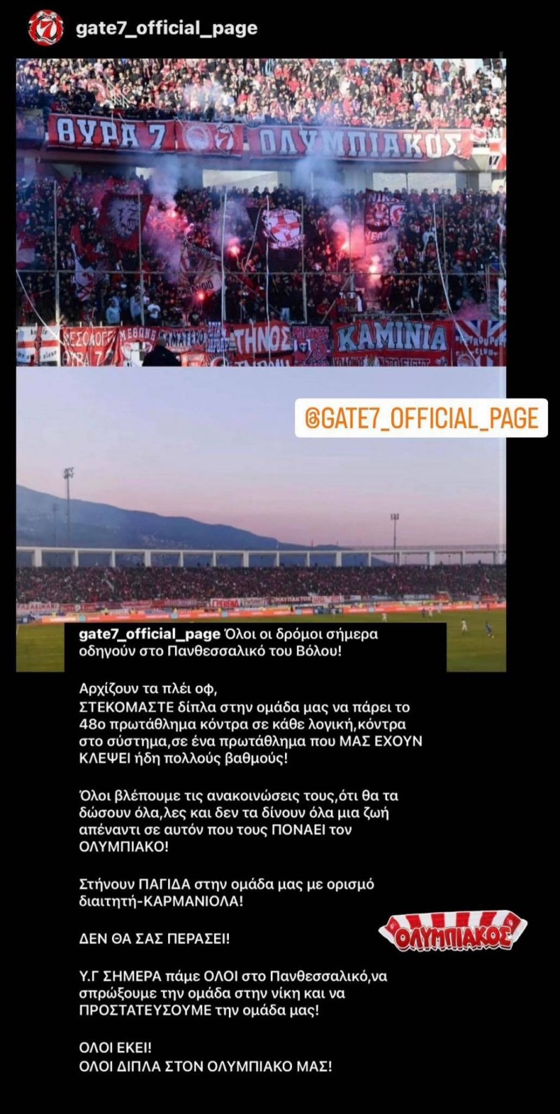 Κάλεσμα στον κόσμο του Ολυμπιακού να βρεθεί στο Πανθεσσαλικό απηύθυνε η Θύρα 7, ενόψει της σημερινής (19/3, 17:30) «μάχης» με τον Βόλο, για την 1η αγωνιστική των πλέι οφ του πρωταθλήματος.