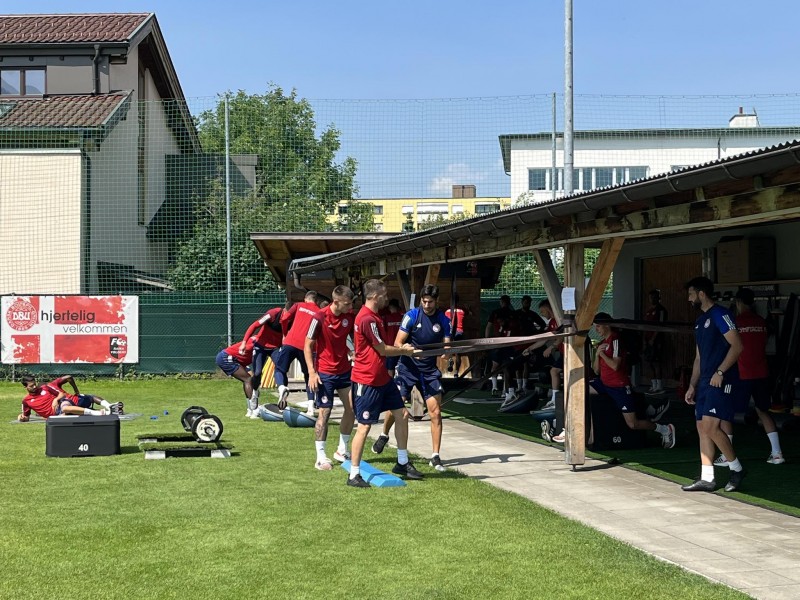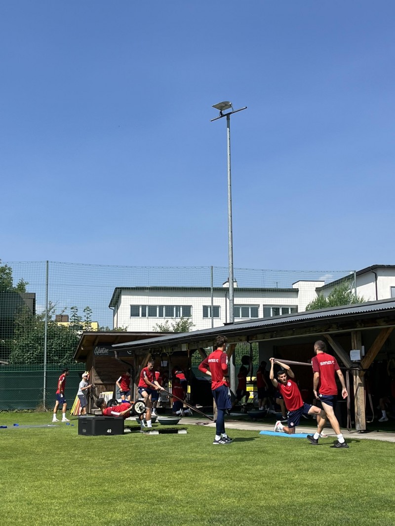 Οι «ερυθρόλευκοι» στην πρωινή προπόνηση επί αυστριακού εδάφους, ήταν με την ίδια όρεξη και διάθεση για δουλειά. Το πρόγραμμα της πρωινής προπόνησης περιελάμβανε εκγύμναση με κυκλικές ασκήσεις ενδυνάμωσης και ισορροπίας, υπό της οδηγίες του νέου γυμναστής των «ερυθρολεύκων», Βίκτορ Λαφουέντε Ναδάλες, ο οποίος για ακόμα μία φορά ήταν αρκετά σχολαστικός και προσεκτικός με τους παίκτες.