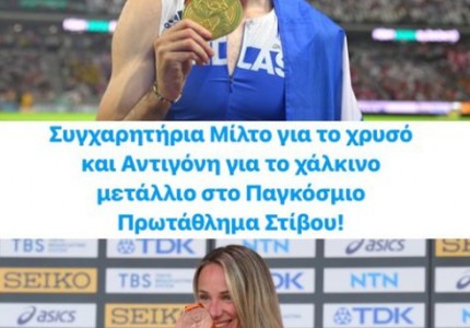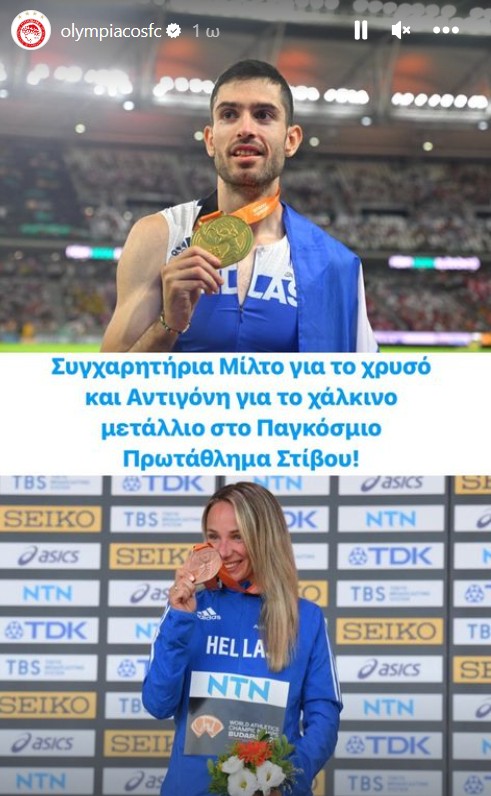 Μάλιστα, η ΠΑΕ Ολυμπιακός συνεχάρη τους δύο σπουδαίους πρωταθλητές της Ελλάδας για τις επιδόσεις τους στη διοργάνωση της Ουγγαρίας, με ανάρτηση στα social media, γράφοντας χαρακτηριστικά: «Συγχαρητήρια Μίλτο για το χρυσό και Αντιγόνη για το χάλκινο μετάλλιο στο Παγκόσμιο πρωτάθλημα στίβου».