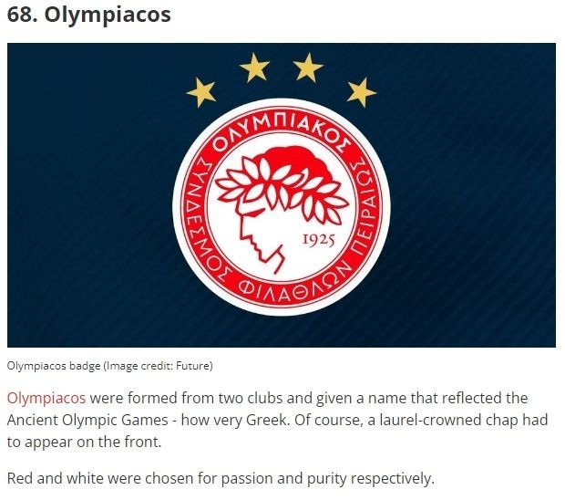 Το γνωστό περιοδικό, λοιπόν, ετοίμασε μία λίστα με τα 100 κορυφαία σήματα στην ιστορία του ποδοσφαίρου και σε αυτήν συμπεριέλαβε και αυτό των «ερυθρόλευκων», γράφοντας χαρακτηριστικά: «Ο Ολυμπιακός σχηματίστηκε από δύο συλλόγους και πήρε όνομα που αντικατοπτρίζει τους αρχαίους Ολυμπιακούς Αγώνες. Πόσο ελληνικό; Φυσικά, ένας Δαφνοστεφανωμένος τύπος έπρεπε να εμφανιστεί στο μπροστινό μέρος. Το κόκκινο και το λευκό επελέγησαν για το πάθος και την αγνότητα αντίστοιχα».