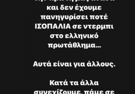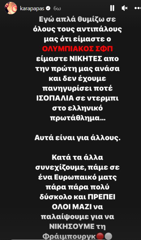 Το δικό του μήνυμα μέσω social media έστειλε ο Κώστας Καραπαπάς, μετά την ισοπαλία των Πειραιωτών με την ΑΕΚ στην OPAP Arena για την 4η αγωνιστική της Stoiximan Super League.