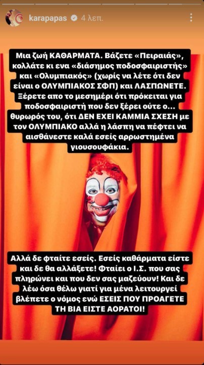 Συγκεκριμένα, ο Κώστας Καραπαπάς αναφέρει: «Μια ζωή ΚΑΘΑΡΜΑΤΑ. Βάζετε ''Πειραιάς'' κολλάτε και ένα ''διάσημος ποδοσφαιριστής'' και ''Ολυμπιακό'' (χωρίς να λέτε ότι δεν είναι ο ΟΛΥΜΠΙΑΚΟΣ ΣΦΠ) και ΛΑΣΠΩΝΕΤΕ. Ξέρετε από το μεσημέρι ότι πρόκειται για ποδοσφαιριστή που δεν ξέρει ούτε ο... θυρωρός του, ότι ΔΕΝ ΕΧΕΙ ΚΑΜΜΙΑ ΣΧΕΣΗ με τον Ολυμπιακό αλλά η λάσπη να πέφτει να αισθάνεστε καλά εσείς αρρωστημένα γιουσουφάκια. Αλλά δεν φταίτε εσείς. Εσείς καθάρματα είστε και δεν θα αλλάξετε! Φταίει ο Ι.Σ. που σας πληρώνει και που δεν σας μαζεύουν! Και δεν λέω όσα θέλω γιατί για εμένα λειτουργεί βλέπετε ο νόμος, ενώ ΕΣΕΙΣ ΠΟΥ ΠΡΟΑΓΕΤΕ ΤΗ ΒΙΑ ΕΙΣΤΕ ΑΟΡΑΤΟΙ!».