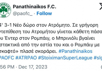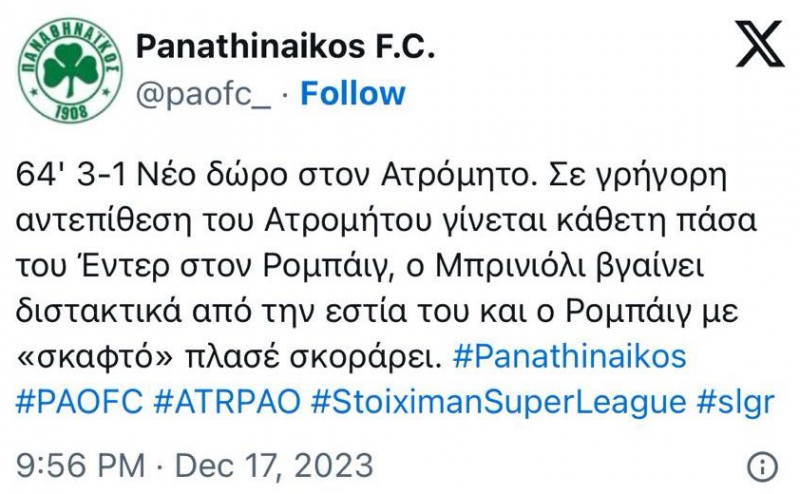 Πιο συγκεκριμένα, ο επίσημος λογαριασμός του Παναθηναϊκού στο twitter εξέθεσε ανεπανόρθωτα και εξευτέλισε τον Γιοβάνοβιτς και την εικόνα της ομάδας, με ένα ποστ για το γκολ του Ατρόμητο, γράφοντας μεταξύ άλλων για δώρα κλπ. «64' 3-1 Νέο δώρο στον Ατρόμητο. Σε γρήγορη αντεπίθεση του Ατρομήτου γίνεται κάθετη πάσα του Έντερ στον Ρομπάιγ, ο Μπρινιόλι βγαίνει διστακτικά από την εστία του και ο Ρομπάιγ με «σκαφτό» πλασέ σκοράρει», αναφέρει ο Παναθηναϊκός.