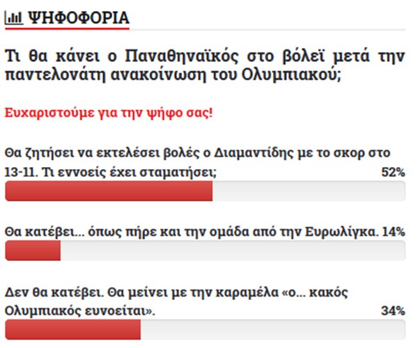 Ξεκάθαρο νικητή είχαμε στην τελευταία ψηφοφορία που κάναμε, εδώ, στο redking.gr, με ερώτημα «Τι θα κάνει ο Παναθηναϊκός στο βόλεϊ μετά την παντελονάτη ανακοίνωση του Ολυμπιακού;».