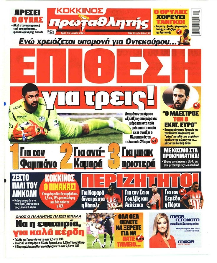 Το πρωτοσέλιδο του «Κόκκινου Πρωταθλητή», αλλά και του «ΓΑΥΡΟΥ», μπορείτε να δείτε μέσω του σάιτ μας. Καθημερινά εδώ, πώς κυκλοφορεί η εφημερίδα που καλύπτει όλη την «ερυθρόλευκη» δραστηριότητα.