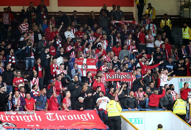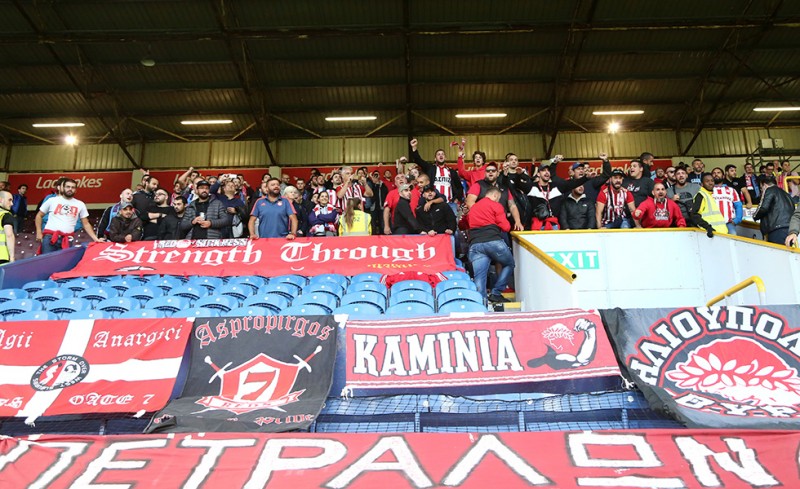 Περισσότεροι από 500 οπαδοί του Θρύλου βρέθηκαν στο «Τερφ Μουρ», έδωσαν «ερυθρόλευκο» χρώμα στο γήπεδο των «κλάρετς» και στήριξαν, με εντυπωσιακό τρόπο, τις προσπάθειες των ποδοσφαιριστών του Πέδρο Μαρτίνς.