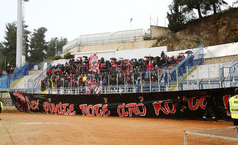 Το «παρών» και στη Λαμία δίνει ο κόσμος του Ολυμπιακού, παρά την ισχυρή βροχόπτωση. Μάλιστα, οι οπαδοί του Θρύλου σήκωσαν ένα πανό για τα θύματα της Θύρας 7.