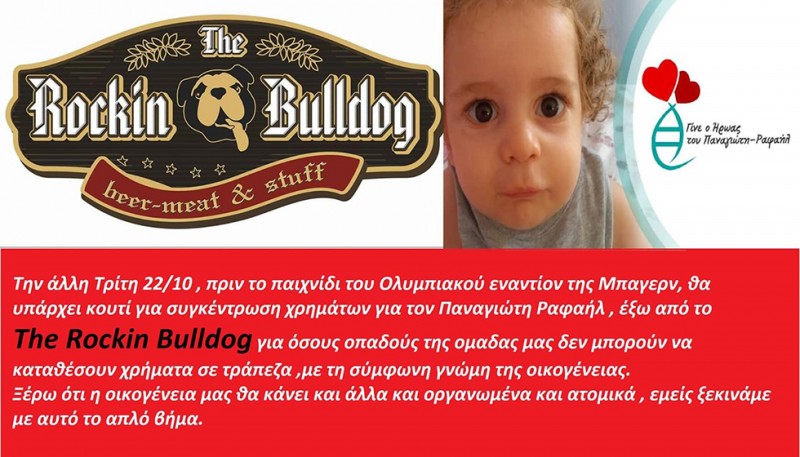 Συγκεκριμένα, την Τρίτη 22/10, πριν τον αγώνα του Ολυμπιακού με τη Μπάγερν Μονάχου, έξω από το The Rockin Bulldog θα υπάρχει ένα ειδικό κουτί, με τη σύμφωνη γνώμη της οικογένειας, για όσους οπαδούς του Ολυμπιακού θέλουν να βοηθήσουν.