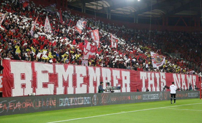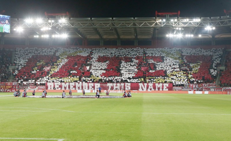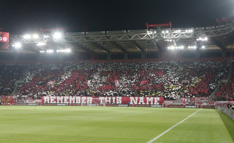 Εντυπωσιακό, όπως πάντα, ήταν το κορεό που έκαναν οι οπαδοί του Ολυμπιακού πριν την έναρξη του αγώνα με την Άιντραχτ Φρανκφούρτης.