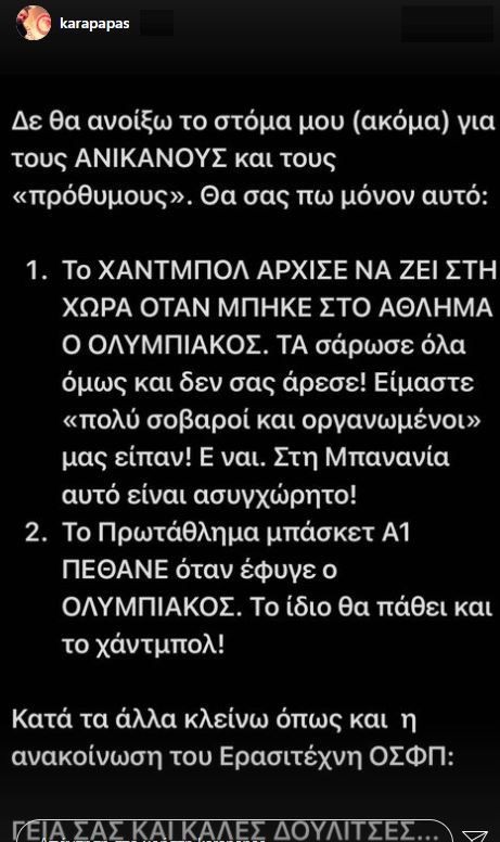 Ο Κώστας Καραπαπάς δεν καταπιάνεται μόνο με τα ποδοσφαιρικά δρώμενα του Συλλόγου. Άλλωστε, οτιδήποτε συμβαίνει γύρω από τον Ολυμπιακό, σε οποιοδήποτε άθλημα, δεν αφήνει κανέναν ασυγκίνητο, στον Σύλλογο. Ως Ολυμπιακοί, άπαντες ενδιαφέρονται για όλα τα θέματα που ταλανίζουν τον μεγαλύτερο Σύλλογο της Ελλάδας. Έτσι, ο Αντιπρόεδρος του Ολυμπιακού δεν άφησε να… πέσουν κάτω, όλα αυτά που συμβαίνουν γύρω από τον χώρο του χάντμπολ.
