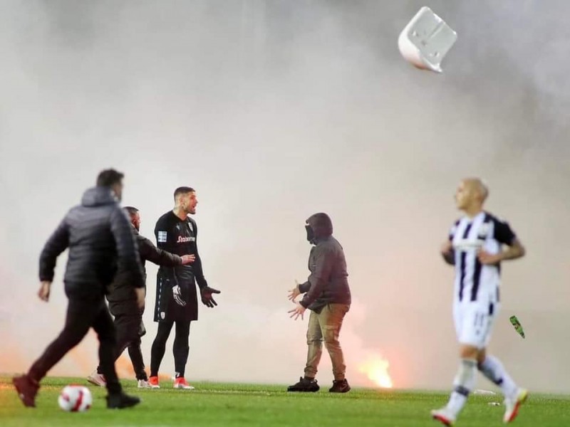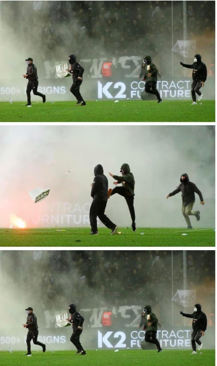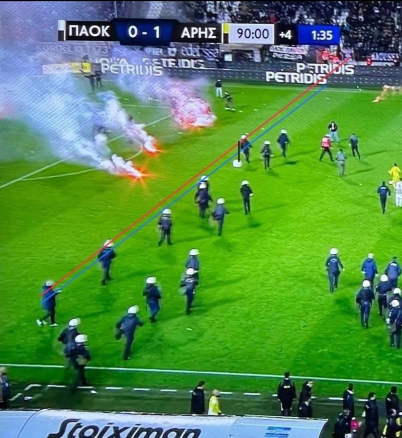 Οι δε γνωστοί- άγνωστοι οπαδοί που εισήλθαν στον αγωνιστικό χώρο, αν δεν αποδειχθεί ότι ήταν οπαδοί του Ολυμπιακού, πιθανόν να ήταν Μπαόκια που μπούκαραν διαμαρτυρόμενοι για την αποχώρηση της Φένιας από το bachelor!