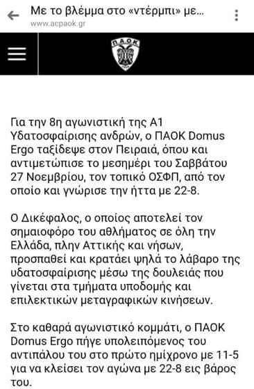 Όλη η Ελλάδα εξ άλλου είδε με την γραμμή του var ότι οι παίχτες του ΠΑΟΚ καλύπτονταν , από τις διμοιρίες των ΜΑΤ άρα λανθασμένα ακυρώθηκε το γκολ της Μπαοκάρας. Τρέμουν στον Πειραιά την ομαδάρα που έφτιαξε ο «προπονηταράς με τον σκούφο και το κασκόλ» και επινοούν κάθε τρόπο για να απομακρύνουν τον Μπάοκ από την κορυφή. Είναι ικανό το Κράτος των Αθηνών να κλείσει αναίτια την Τούμπα στα «ντέρμπι» με Λαμία και Αστέρα Τρίπολης. Δεν πιστεύω να τους «εξοντώσουν» και να τους κλείσουν και στα «δύσκολα» ματς με Παναιτωλικό και με ΟΦΗ.