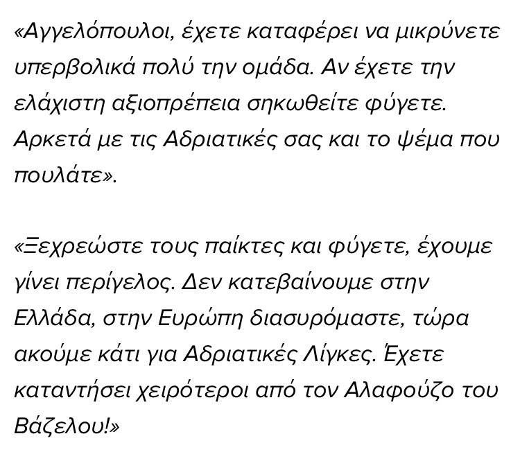 Αυτοί που τώρα αποθεώνουν είναι γιατί δεν μπορούν να κάνουν διαφορετικά. Να μην ξεχνάτε ποτέ τι έλεγαν όλοι αυτοί, και πως σας «χρησιμοποιούσαν» τις στιγμές που ήσασταν στεναχωρημένοι. Τις στιγμές που τα βάζατε με τους Αγγελόπουλους, με τους προπονητές και τους παίχτες ως κύριους υπεύθυνους για τα «κλεμμένα» Πρωταθλήματα.