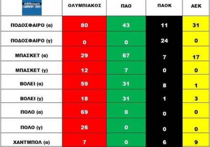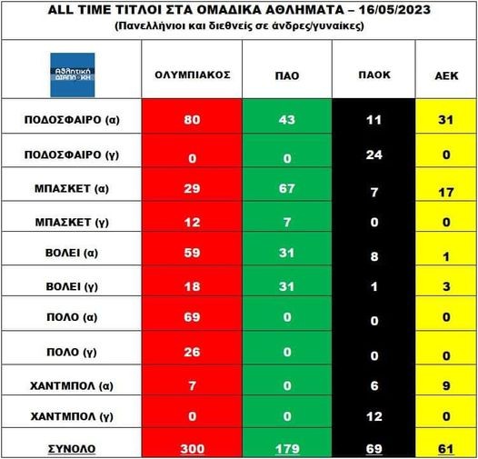 Δεν πρόλαβε καλά- καλά να συμπληρώσει ο Ολυμπιακός τους 300 τίτλους πριν λίγες μέρες στα ομαδικά αθλήματα και ήδη έγιναν 301. Στο μεσοδιάστημα δε, πανηγύρισε το Πανελλήνιο Πρωτάθλημα Κορασίδων στο βόλεϊ, και τα Πρωταθλήματα στην κολύμβηση, τόσο στους άντρες ( 58ο), τόσο στις γυναίκες (54ο) όσο και στην γενική βαθμολογία φτάνοντας στα 64 Πρωταθλήματα συνολικά, την ίδια ώρα που οι «ειδικοί» του αθλήματος τον είχαν ξεγραμμένο «δίνοντας» το Πρωτάθλημα στο Φάληρο. Παντού σε όλα τα αθλήματα, δεν τους νοιάζει ποιος θα στεφθεί Πρωταθλητής αρκεί να μην είναι ο Ολυμπιακός. Και όσο πέφτει η φάπα στον σβέρκο, τόσο ψάχνουν την «αποτυχία» μας για να ικανοποιηθούν τα κόμπλεξ που τους έχουμε δημιουργήσει.