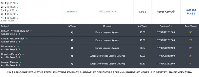 Το πιο τυχερό... άτυχο δελτίο της ιστορίας παίχτηκε την περασμένη Πέμπτη στη Stoiximan. Μέλος της Stoiximan έκανε Cash Out στα 94€, σε ένα δελτίο το οποίο επαληθεύτηκε και θα του έδινε σχεδόν μισό εκατομμύριο!